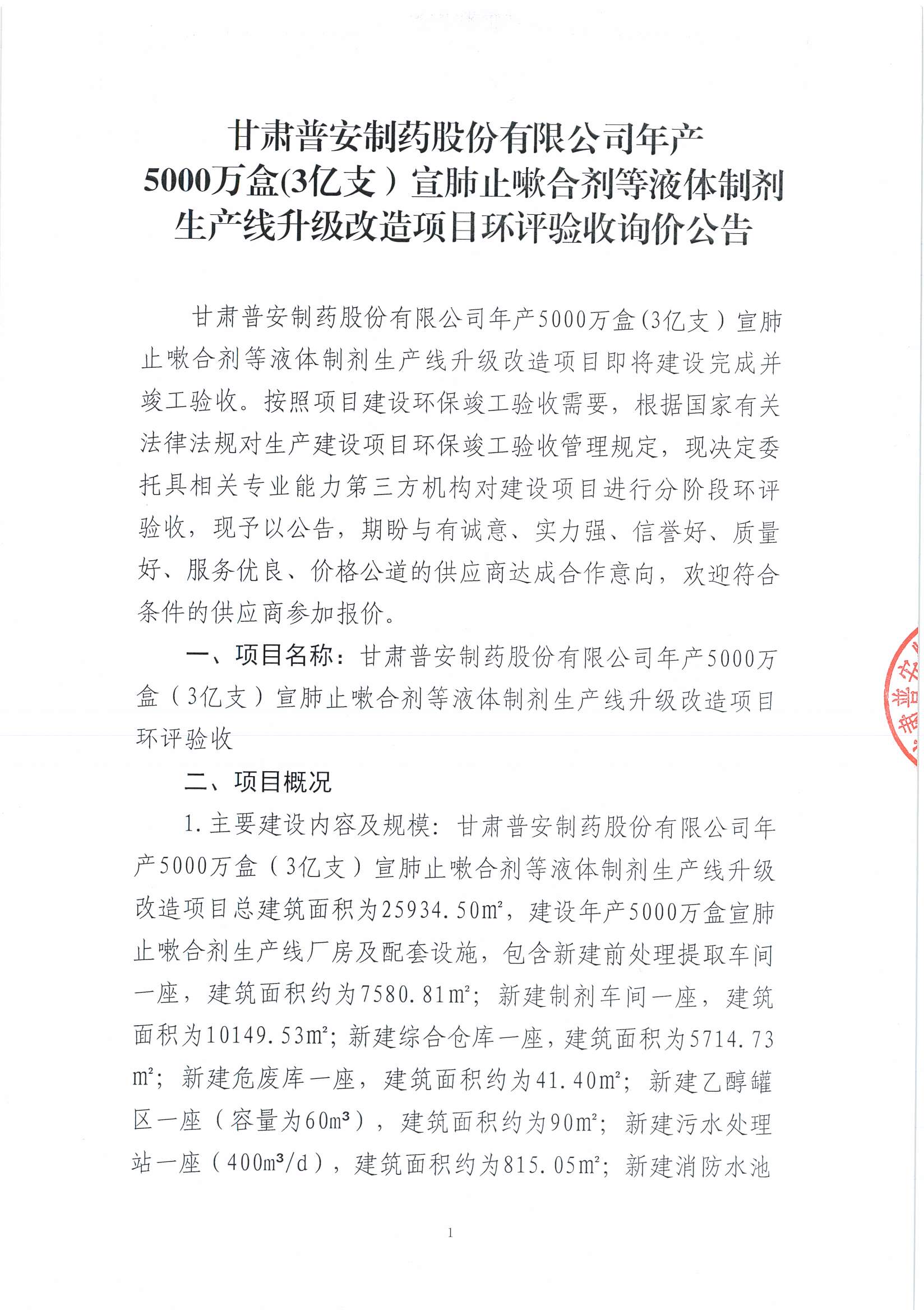 甘肅普安制藥股份有限公司年產(chǎn)5000萬盒(3億支)宣肺止嗽合劑等液體制劑生產(chǎn)線升級(jí)改造項(xiàng)目環(huán)評(píng)驗(yàn)收詢價(jià)公告