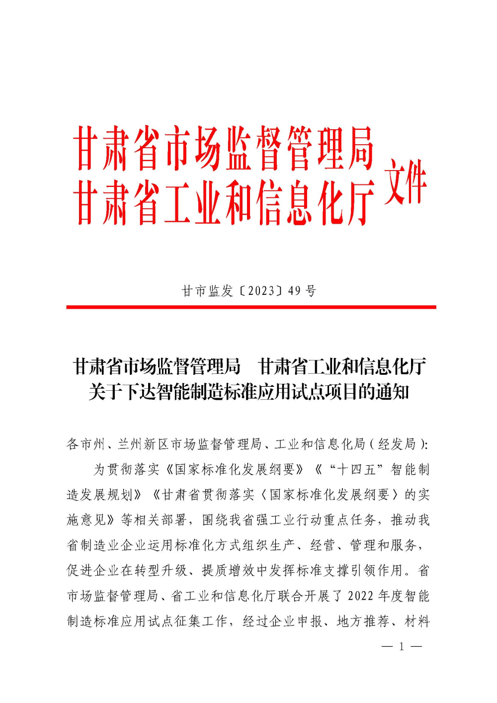近日,甘肅省市場監(jiān)督管理局、甘肅省工業(yè)和信息化廳公布了省級智能制造標(biāo)準(zhǔn)應(yīng)用試點項目名單。