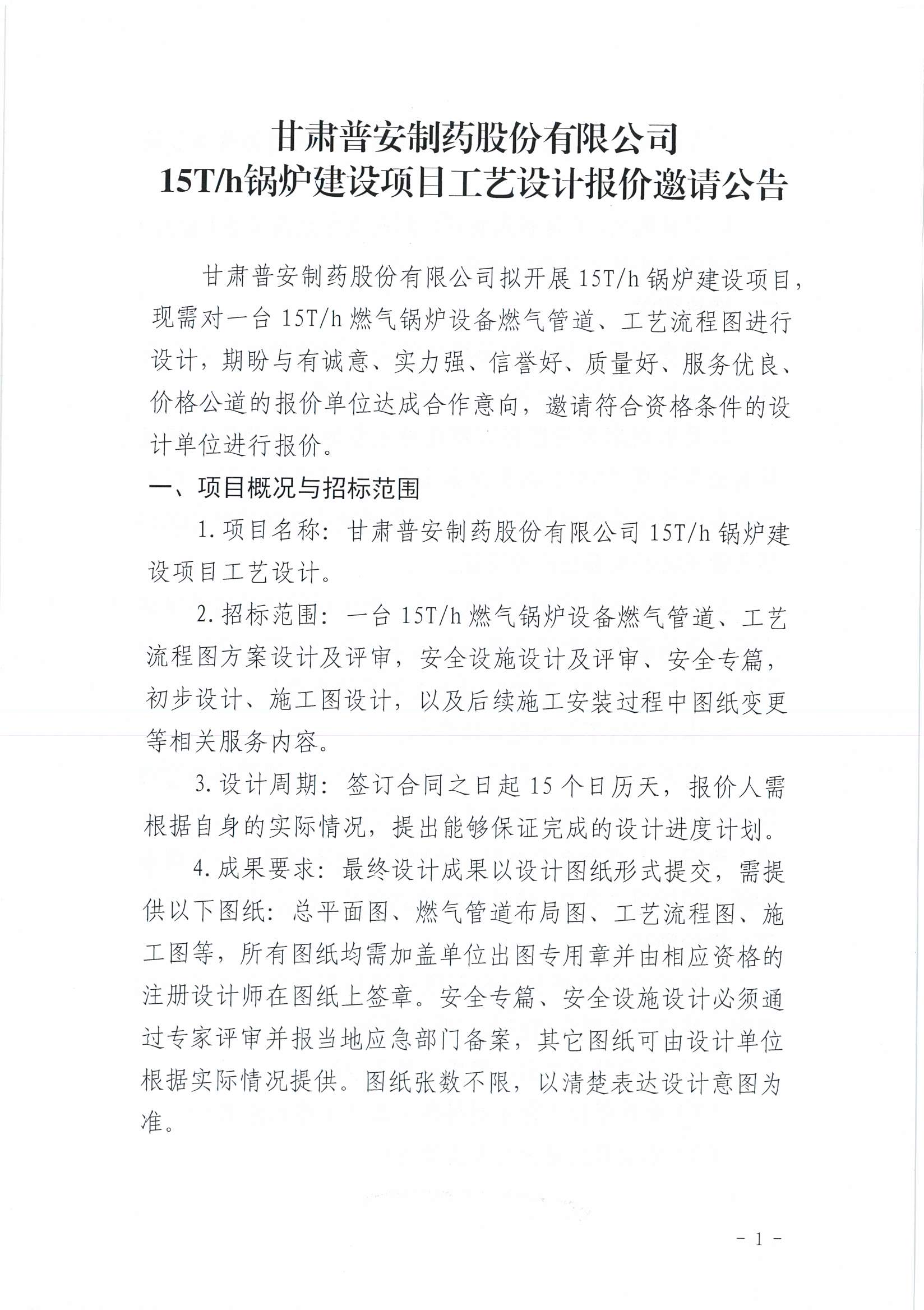 甘肅普安制藥股份有限公司15T/h鍋爐建設(shè)項(xiàng)目工藝設(shè)計(jì)報(bào)價(jià)邀請公告