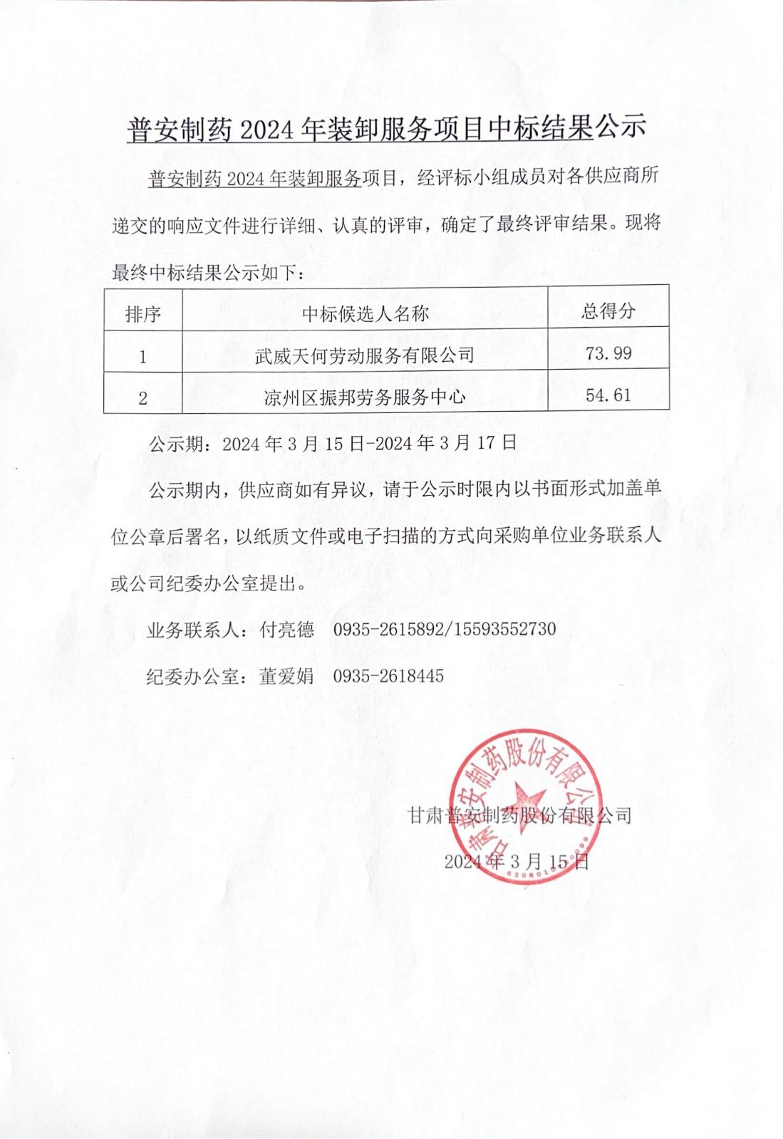 普安制藥2024年裝卸服務(wù)項(xiàng)目中標(biāo)結(jié)果公示