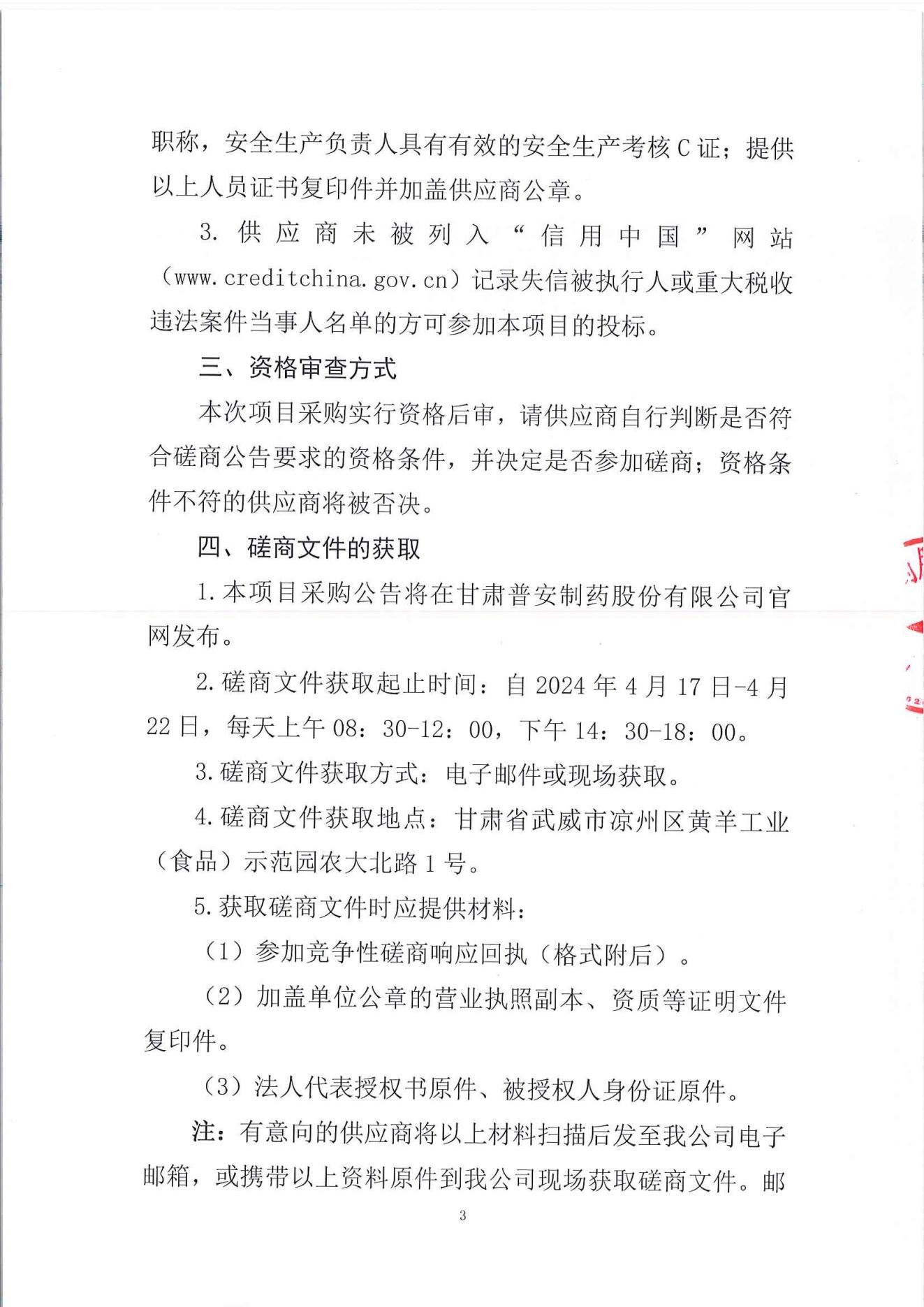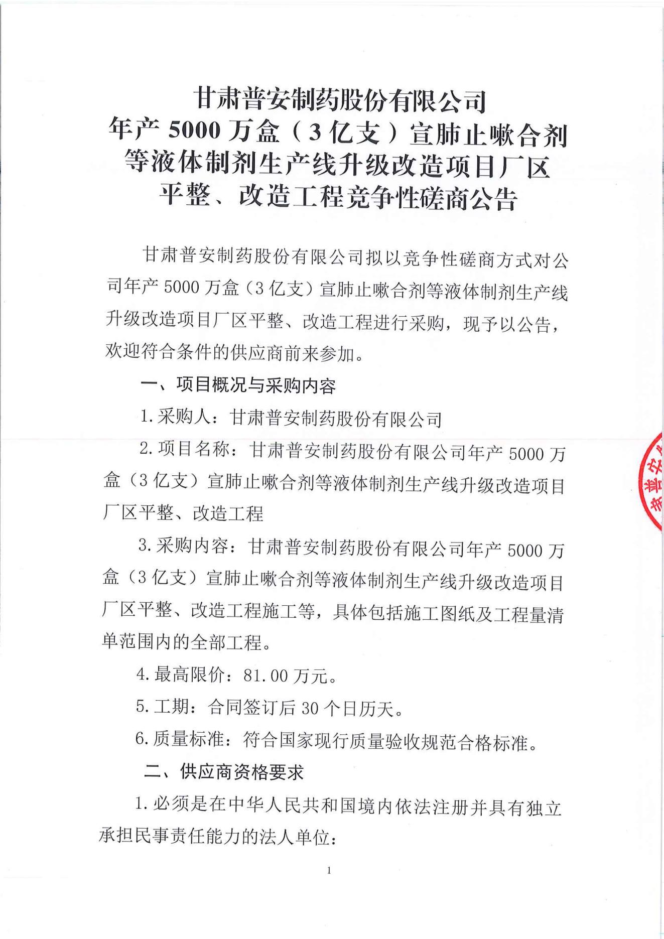 甘肅普安制藥股份有限公司年產5000萬盒(3億支)宣肺止嗽合劑等液體制劑生產線升級改造項目廠區平整、改造工程競爭性磋商公告