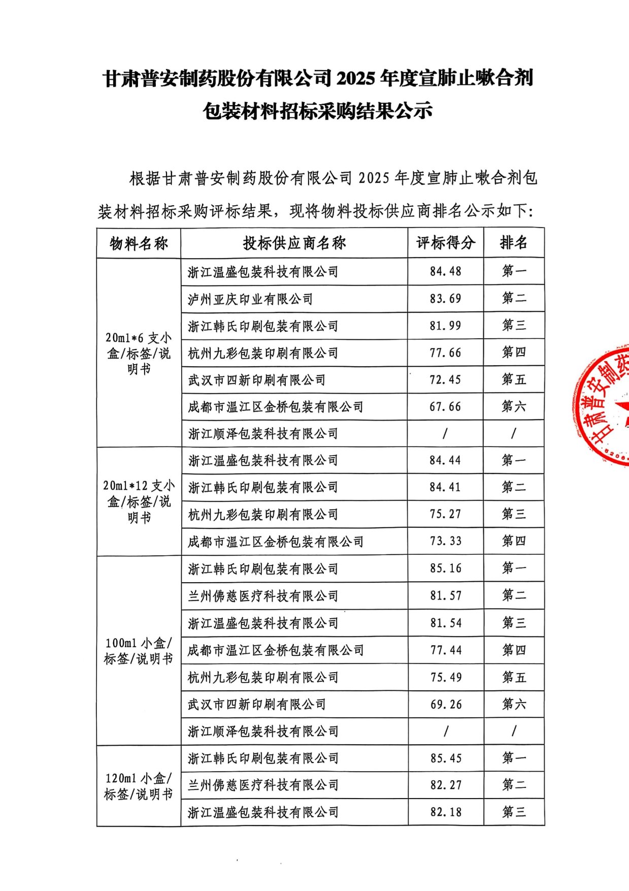 甘肅普安制藥股份有限公司2025年宣肺止嗽合劑包裝材料招標采購結果公示