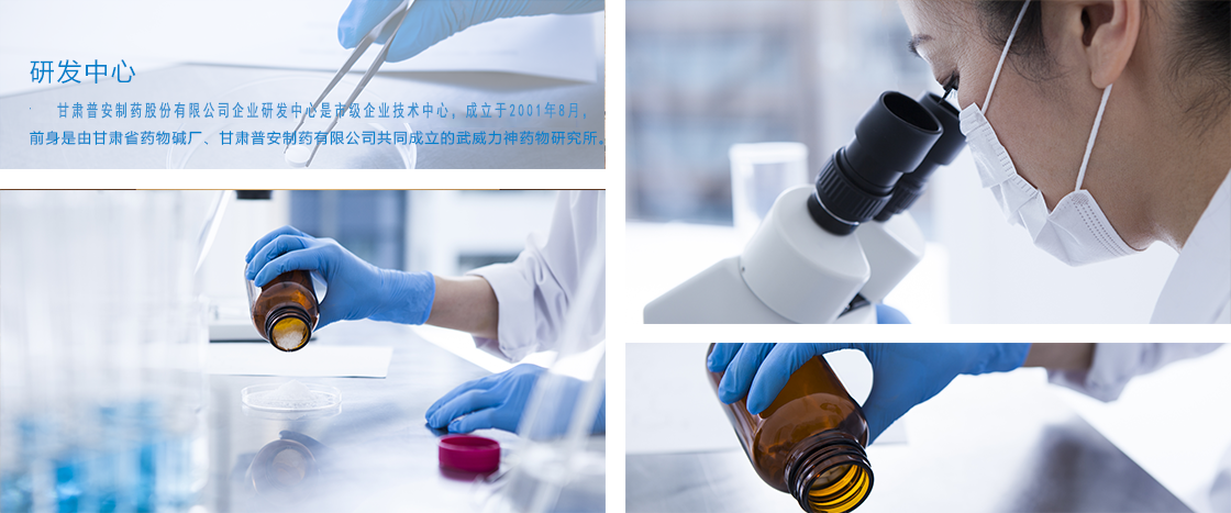 甘肅普安制藥股份有限公司企業(yè)研發(fā)中心是市級企業(yè)技術中心,成立于2001年8月,前身是由甘肅省藥物堿廠、甘肅普安制藥有限公司共同成立的武威力神藥物研究所。經過不斷的發(fā)展,研發(fā)中心已經成為集信息收集與分析、技術創(chuàng)新、新產品研發(fā)、中試生產于一體的研發(fā)體系。