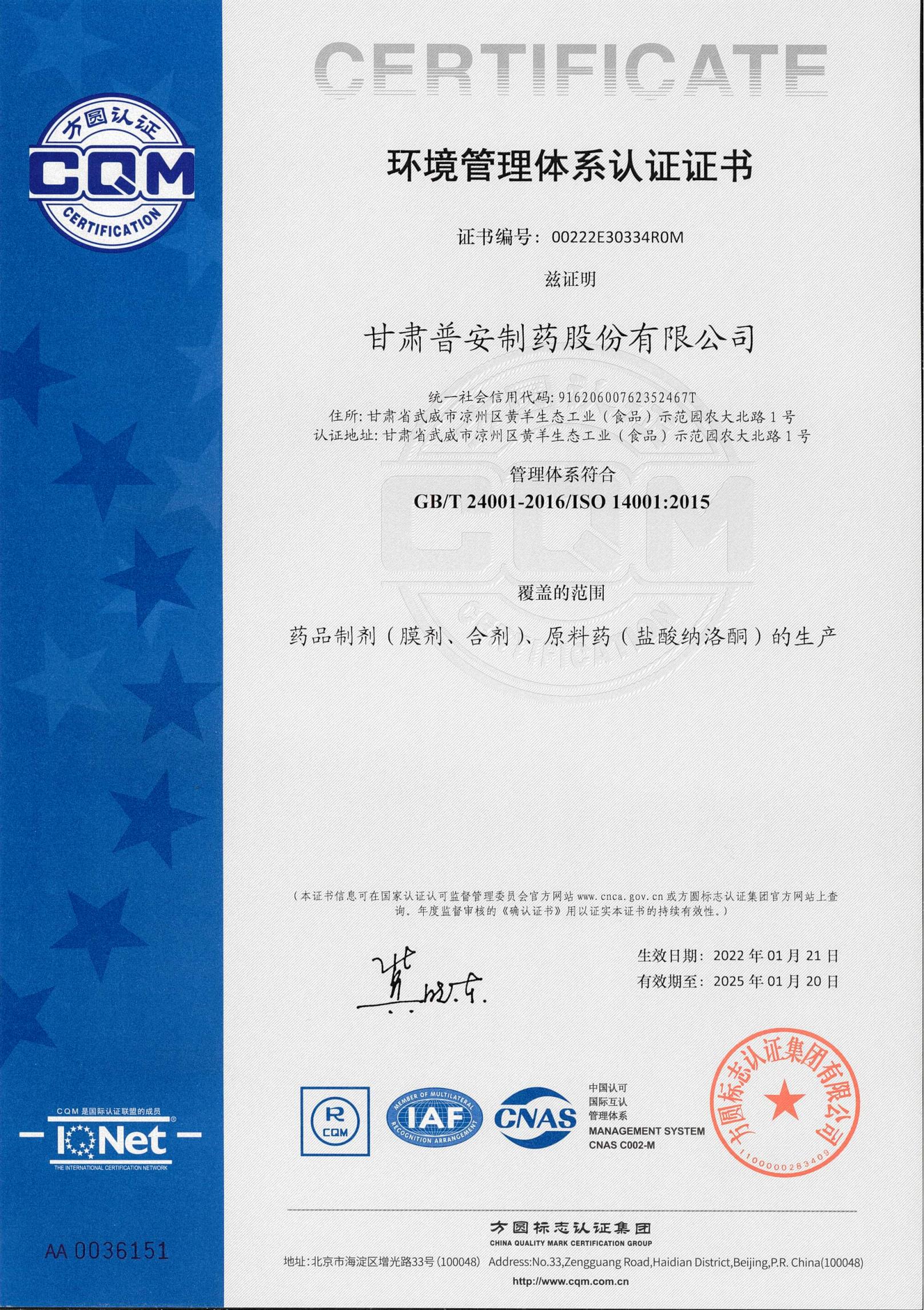環境管理體系認證證書